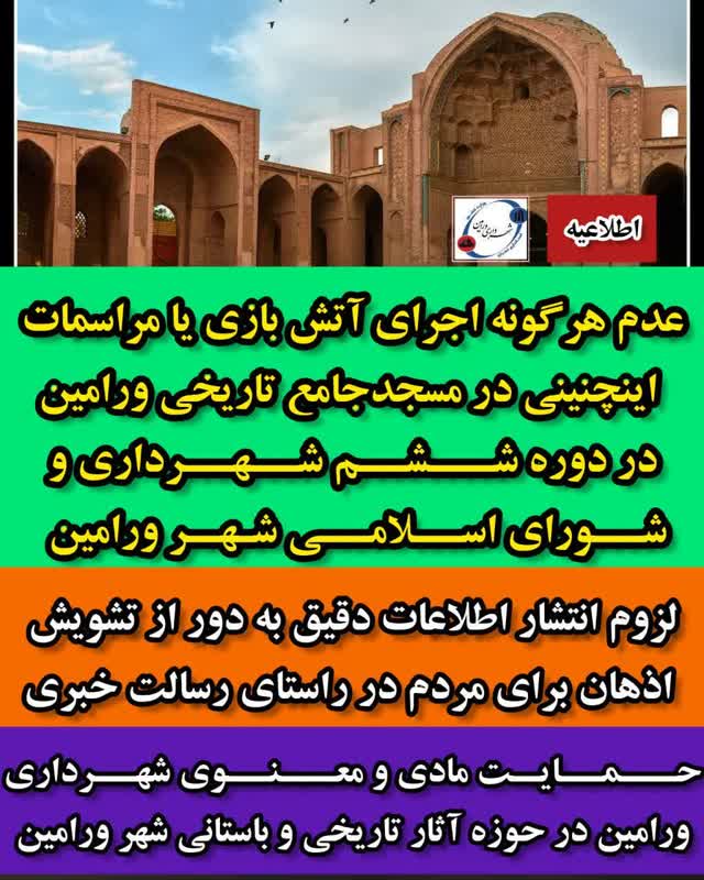 اطلاعیه | عدم هرگونه اجرای آتش بازی یا مراسمات اینچنینی در مسجدجامع تاریخی ورامین در دوره ششم شهرداری و شورای اسلامی شهر ورامین / لزوم انتشار اطلاعات دقیق به دور از تشویش اذهان برای مردم در راستای رسالت خبری