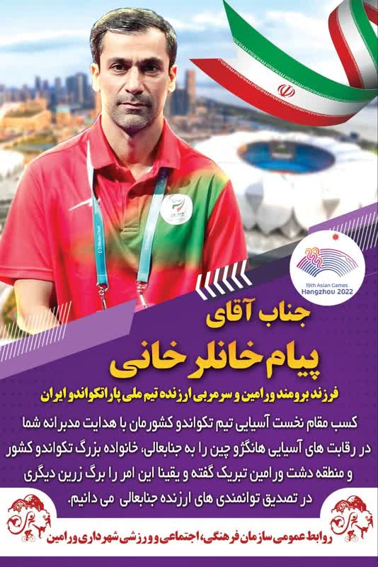 تبریک سازمان فرهنگی اجتماعی و ورزشی شهرداری ورامین به استاد پیام خانلرخانی سرمربی تیم تکواندو شهرداری ورامین و تیم ملی پاراتکواندو کشورمان در راستای درخشش در رقابت های آسیایی هانگژو کشور چین