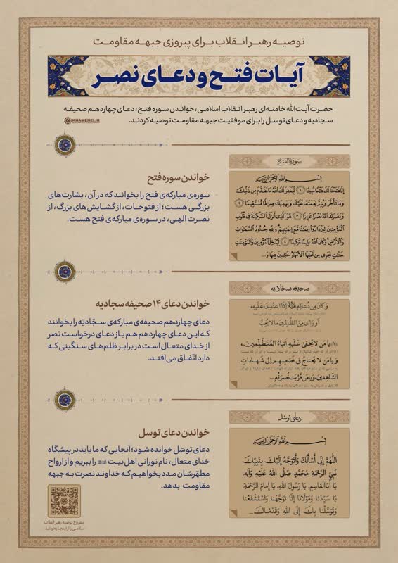 رهبر انقلاب اسلامی در پاسخ به سوالی، قرائت سوره فتح، دعای ۱۴ صحیفه سجادیه و دعای توسل را برای پیروزی جبهه مقاومت توصیه کردند.