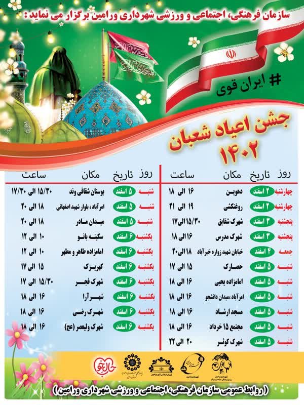 جشن اعیاد شعبان در محلات مختلف ورامین شناسه خبر: 754 تاریخ و زمان ارسال: 2 اسفند 1402 ساعت 11:20 بازدید : 68 نویسنده: farhangiروابط عمومی سازمان فرهنگی اجتماعی و ورزشی شهرداری ورامین