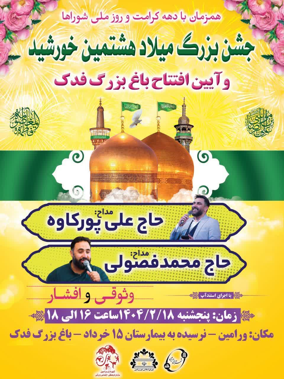 همزمان با دهه کرامت وروز ملی شوراها جشن بزرگ میلاد هشتمین خورشید تابناک آسمان ولایت و امامت حضرت امام رضا علیه السلام وآئین افتتاح باغ بزرگ فدک