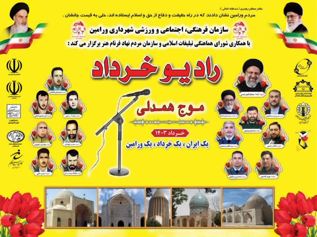 ویژه برنامه ” رادیو خرداد “ شناسه خبر: 1079 تاریخ و زمان ارسال: 9 خرداد 1403 ساعت 12:00 بازدید : 116 نویسنده: farhangiسازمان فرهنگی اجتماعی و ورزشی شهرداری ورامین همزمان با ایام الله 14 و 15 خرداد برگزار می نماید:ویژه برنامه ” رادیو خرداد ”یک ایران، یک خرداد، یک ورامین#وعده_ما: پنجشنبه ۱۰ خردادماه ساعت ۱۶:۳۰ عصر#مکان: میدان امام خمینی(ره) برج علاالدوله ورامین