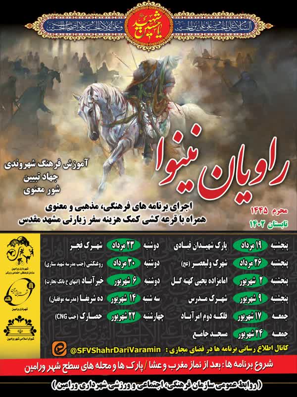 به گزارش روابط عمومی سازمان فرهنگی اجتماعی و ورزشی شهرداری ورامین، ویژه برنامه راویان نینوا ویژه برنامه ایام سوگواری حضرت اباعبدالله الحسین(ع) در ماه محرم و صفر تا اربعین حسینی و پس از آن شهادت امام رضا(ع) در محلات مختلف شهر ورامین اجرا می شود.