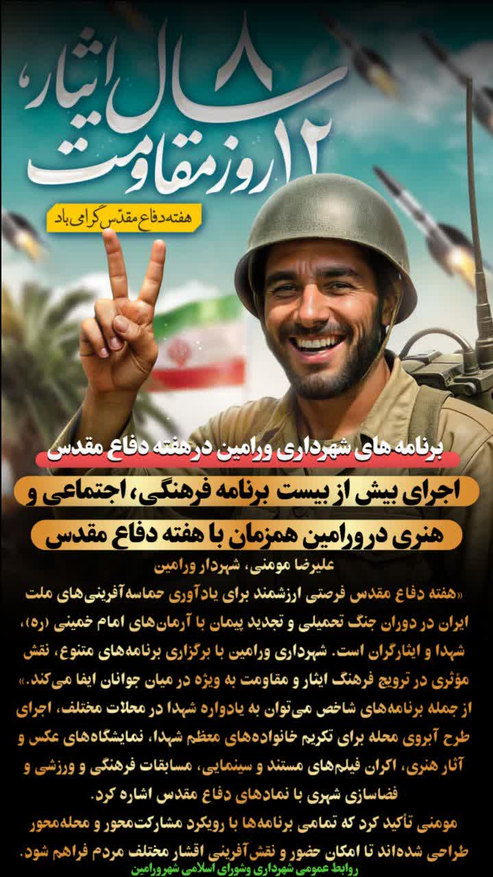علیرضا مومنی، شهردار ورامین با اعلام این خبر اظهار داشت: ((هفته دفاع مقدس)) فرصتی ارزشمند برای یادآوری حماسهآفرینیهای ملت ایران در دوران جنگ تحمیلی و تجدید پیمان با آرمانهای امام خمینی (ره)، شهدا و ایثارگران است. شهرداری ورامین در این راستا وظیفه خود میداند که با برگزاری برنامههای اثرگذار، نقش موثری در ترویج فرهنگ ایثار و مقاومت در میان آحاد مردم، به ویژه نسل جوان، ایفا کند. به گفته شهردار ورامین، سازمان فرهنگی، اجتماعی و ورزشی شهرداری ورامین با همکاری سپاه ،بسیج، آموزشوپرورش، نهادهای هنری و فرهنگی و سایر ادارات شهرستان، بیش از ۲۰ عنوان برنامه را در سطح محلات و مراکز شهری تدارک دیده است.