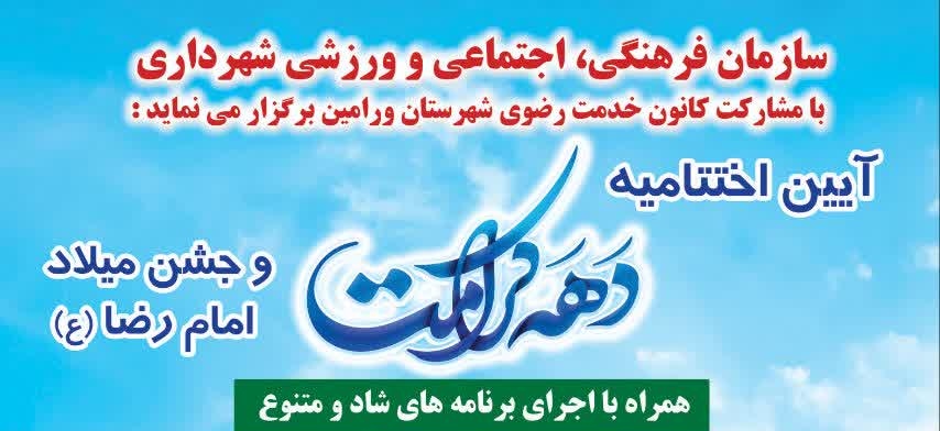 به گزارش روابط عمومی سازمان فرهنگی ورزشی و اجتماعی شهرداری ورامین، اختتامیه دهه کرامت امروز سه شنبه در مسجد جامع تاریخی ورامین برگزار می شود